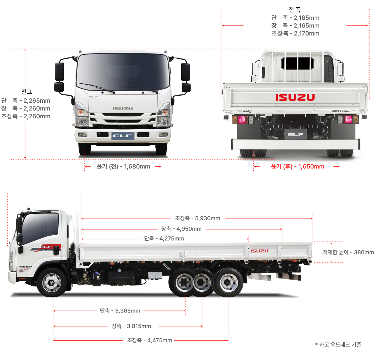 | 적재함 (mm) | 장 | 4,275 | 4,275 | 4,600 | 4,240 | 4,730 |